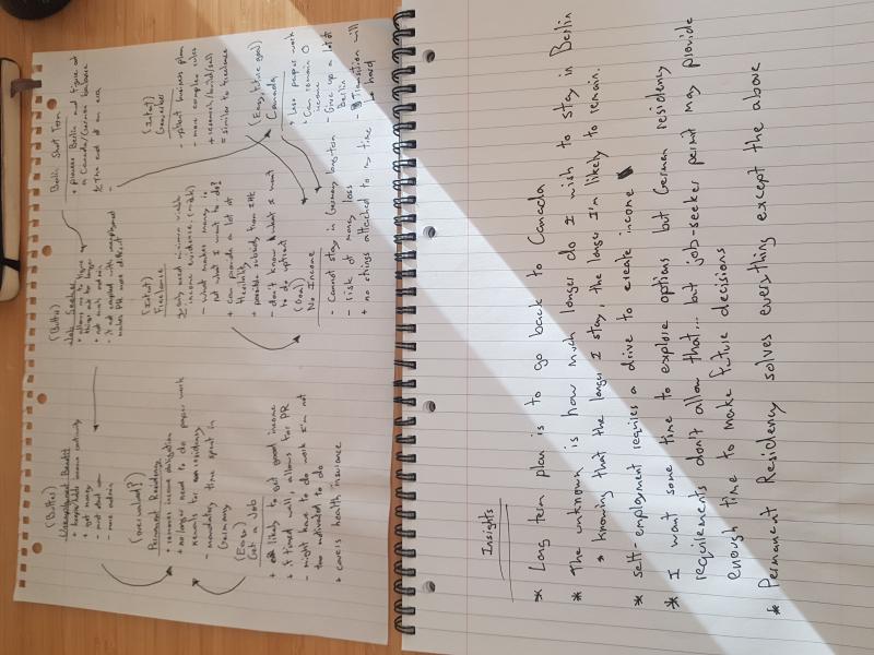 After enjoying a mon th and half break, it was time to evaluate what my options were. This resulted in a complicated decision tree (see image) that was made simpler after a 1 hour consultation with an immigration lawyer (Juliane Linke is my hero). It became very clear to me after our conversation that getting a job is the simplest thing for me to do in order to stay in Germany and also not jeopardize my future ability to stay in Germany.